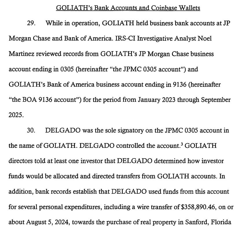 The lawsuit cited $235 million of funds deposited into the JPMorgan account “0305” between 2023 and 2025, of which $123 million was subsequently transferred to Goliath wallets on the Coinbase exchange.