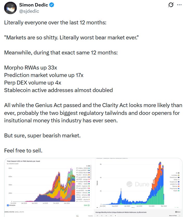 RWAs, prediction markets, and perp DEXs are still booming amid the crypto bear market 🚀.