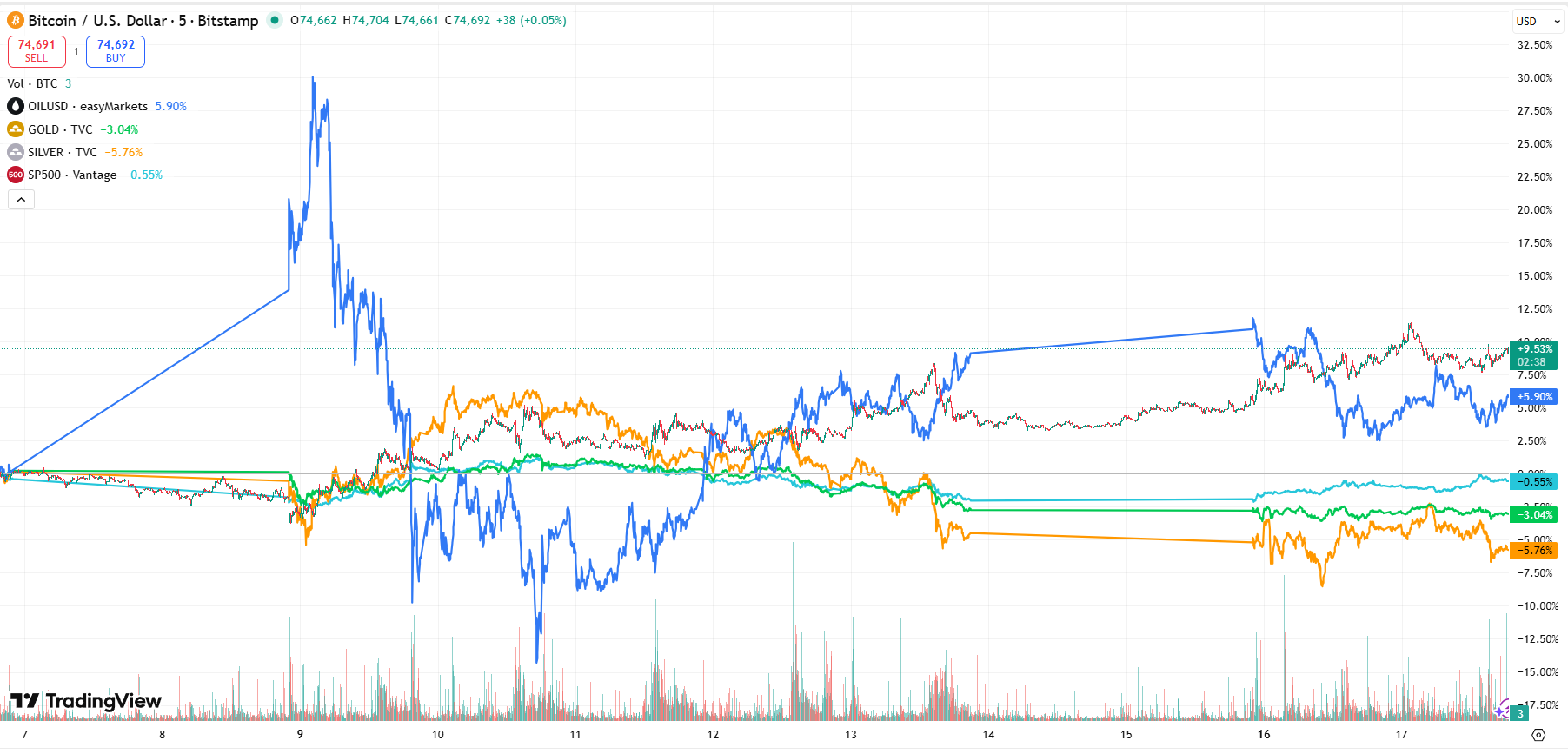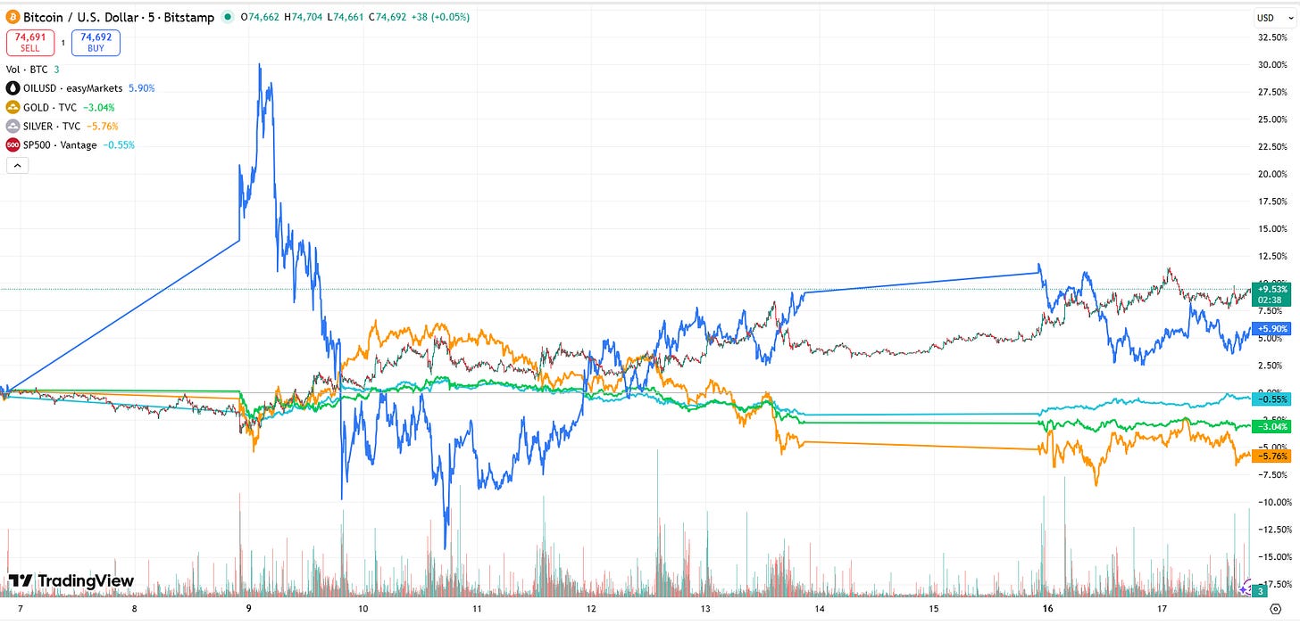 Since February 28, Bitcoin rose 9.4%, outperforming the 5.8% increase in oil price and the negative returns of gold, silver, and the S&P 500, TradingView data shows 📊.