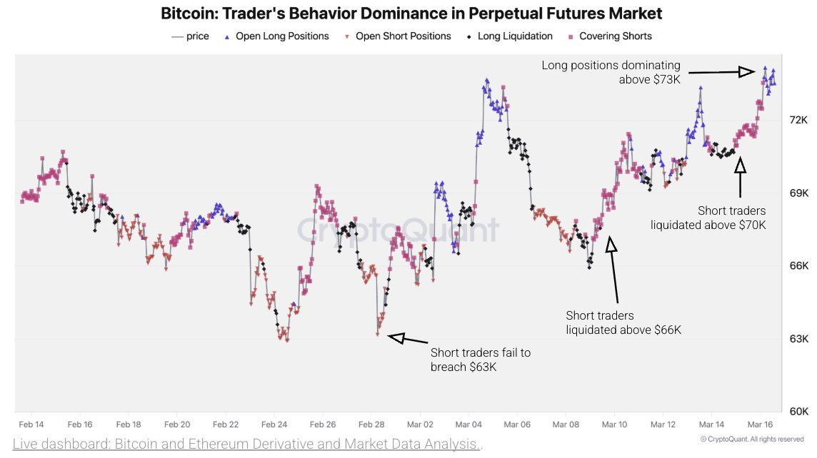 “Shorts were cleared as BTC reclaimed $70K, with fresh longs building above $73K. Positioning has flipped. Long positions are now dominating the perpetual futures market.”